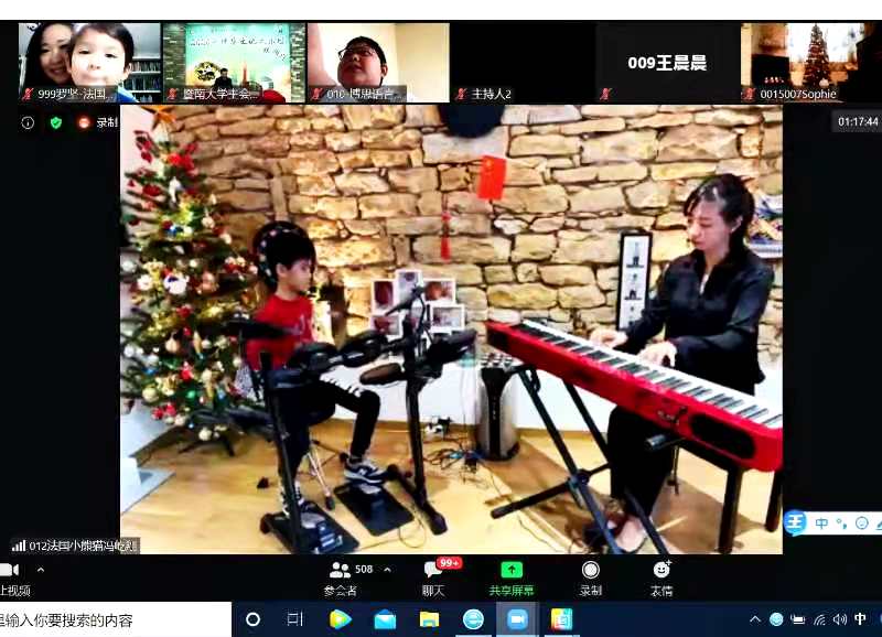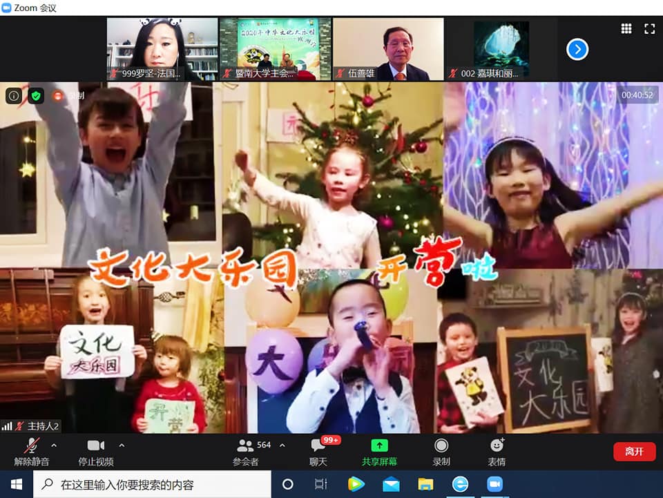 云端“2020年中华文化大乐园欧洲营”开营啦。来自法国营的“法国小熊猫学校”的冯屹翔同学架子鼓表演,柯莉莎同学的古筝演奏都太棒啦!! 欧洲的华裔青少年们和华校校长们近600人参加了暨南大学华文学院组织的开营仪式,13天的丰富多彩的中华文化内容将极大丰富同学们的圣诞假期!